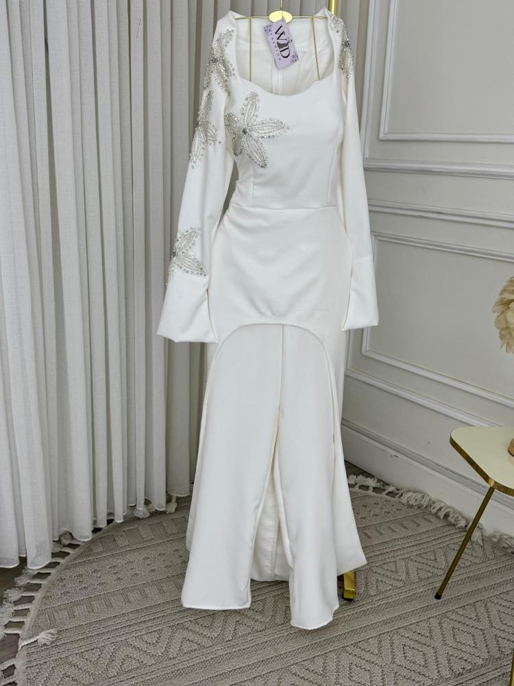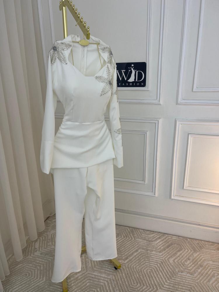جمبسوت أبيض فاخر بتصميم أنثوي جذاب، يتميز بقصة أنيقة تبرز جمال القوام. الأكمام الطويلة مزينة بتطريز فاخر على شكل أوراق مزدانة بحبات الكريستال اللامعة، مما يضفي لمسة من الفخامة والرقي. القماش الفاخر والانسيابي يضمن راحة وأناقة في آنٍ واحد، ما يجعله خيارًا مثاليًا للمناسبات الراقية والسهرات المميزة