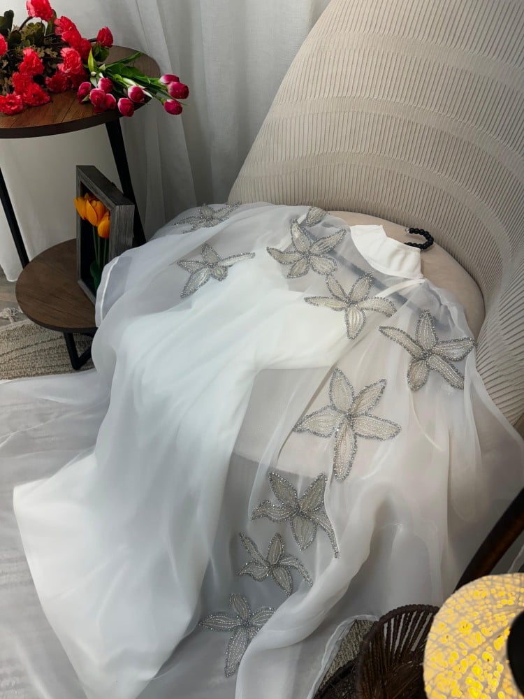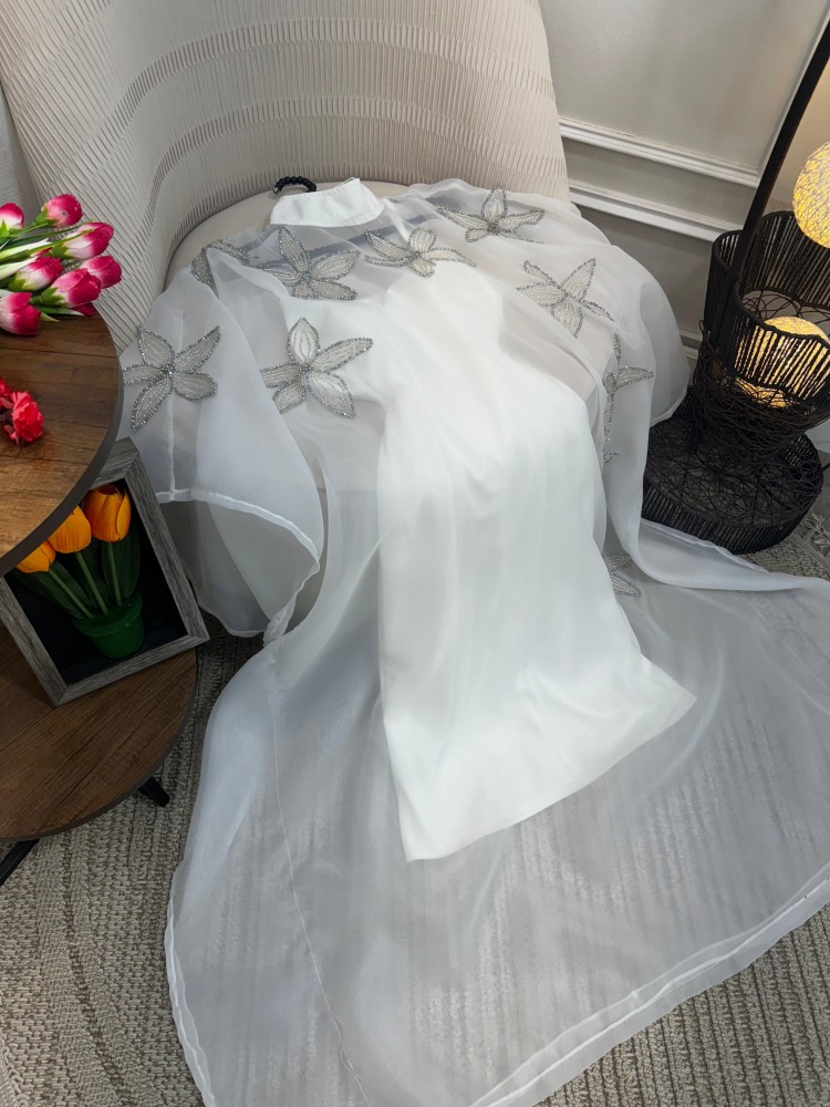 فستان مميز بلونه الابيض مع شال مطرز